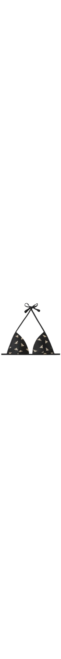 Parte de cima de biquíni em formato de triângulo fixo, sem aro e com bojos almofadados graduados muito suaves, causando um efeito de volume que destaca a linha do decote. O modelo é caracterizado por um bordado dourado em toda a peça sobre um fundo preto.