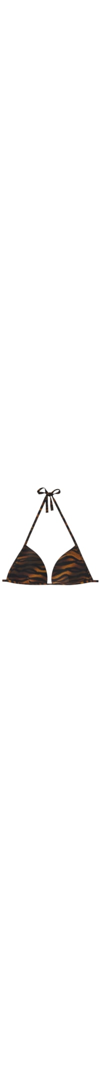 Selecione o tamanhoParte de cima de biquíni em forma de triângulo fixo, sem aro, com copas almofadadas e graduadas para um efeito de volume que realça a linha do decote. Caracteriza-se pelo tecido com padrão de tigre em tons escuros. As alças possuem uma abertura em anel na extremidade, permitindo inseri-las na alça inferior para ajustar atrás ou atar na zona da nuca. Fecho posterior com laço fino adornado por extremidades douradas.