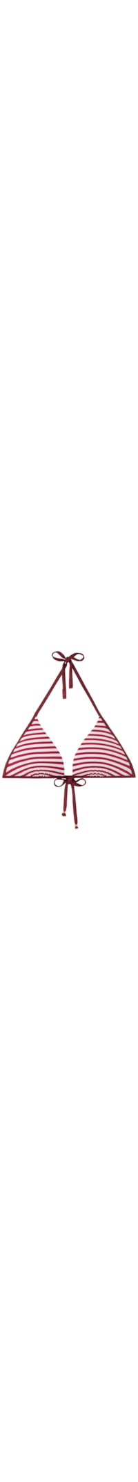 Parte de cima de biquíni em formato de triângulo com copas almofadadas graduadas, sem aro, para um efeito natural. Apresenta um padrão de listras estilo marinheiro. As alças possuem uma abertura em anel na extremidade, que permite inseri-las na alça inferior de amarrar atrás ou atar na nuca. Fechamento posterior com tiras finas para amarrar com laço, adornadas por pérolas douradas na extremidade.