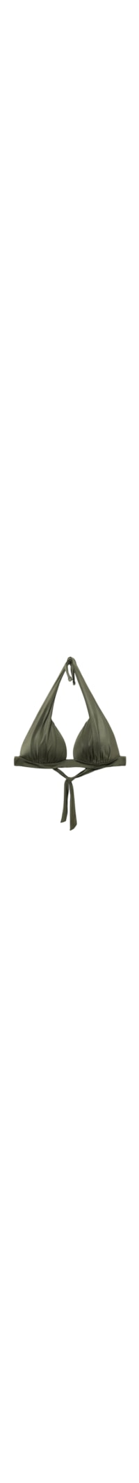 Parte de cima de biquíni no modelo triângulo fixo, sem aro, com bojo graduado que proporciona volume e realça o decote. O tecido brilhante com efeito de seda é decorado com franzidos delicados. As alças possuem argola nas extremidades, permitindo que sejam presas na alça inferior das costas ou amarradas na nuca. Fechamento posterior com laço.