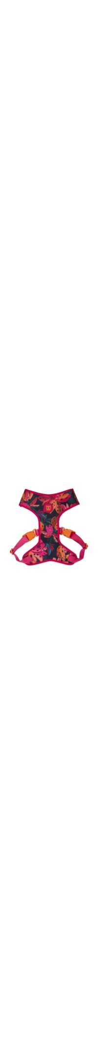 O peitoral rosa é produzido em material têxtil. A peça possui trama aerada permitindo a passagem de ar, regulável tanto na barriga quanto no pescoço, argolas metalizadas para prender a guia na parte posterior, ajustes com fecho por engate, mix de estampas em cores contrastantes, logo da marca aplicada na parte superior e fechamento por velcro.