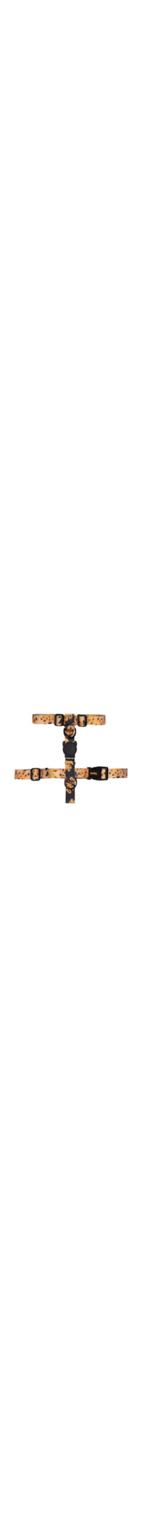 O peitoral preto é produzido em gorgurão. A peça possui formato H, grande capacidade de ajuste tanto no pescoço quanto na cintura, duas posições para prender a guia, estampa figurativa de bananas em cores contrastantes, logo da marca emborrachada aplicada na parte superior e fecho por engate.
