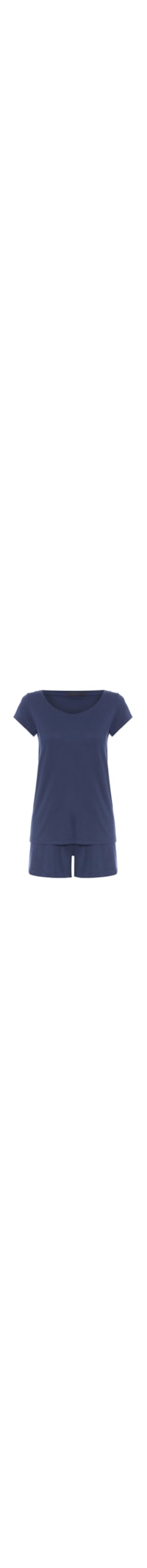 O pijama azul é confeccionado em malha de algodão pima. A blusa possui decote redondo, mangas curtas e acabamento pespontado. O short possui cintura com elástico aplicado, cordão de ajuste e acabamento pespontado.