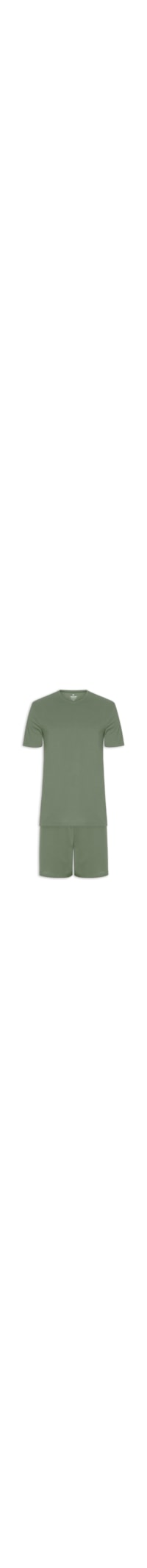 Pijama na cor verde, produzido em malha leve. A camiseta possui modelagem reta, gola careca e acabamento simples. A bermuda apresenta cós com elástico, modelagem reta e solta ao corpo, barra reta.