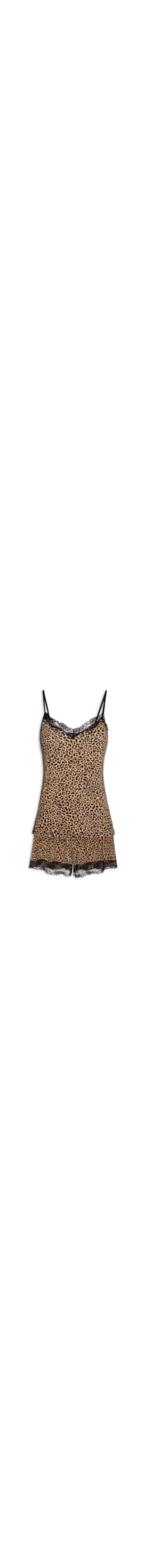 O pijama marrom é confeccionado em malha leve com alta elasticidade. A blusa solta ao corpo possui decote V, alças finas com regulagem, cavas regulares, decote com renda, padronagem de estampa de onça e tag da marca bordada na parte posterior. O short solto ao corpo possui cintura alta, cós com elástico embutido, recortes frontais, barras e recortes com renda, padronagem de estampa de onça e comprimento curto.