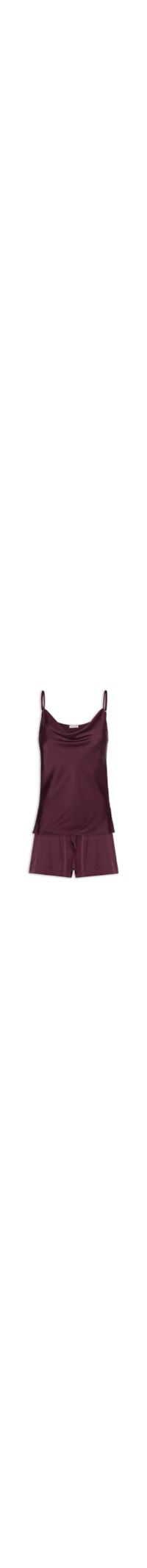 O pijama vinho é confeccionado em tecido leve com média elasticidade. A regata solta ao corpo possui decote degagê e alças finas com regulagem na parte posterior. O short solto ao corpo possui cintura alta, cós com lastex aplicado e comprimento curto.