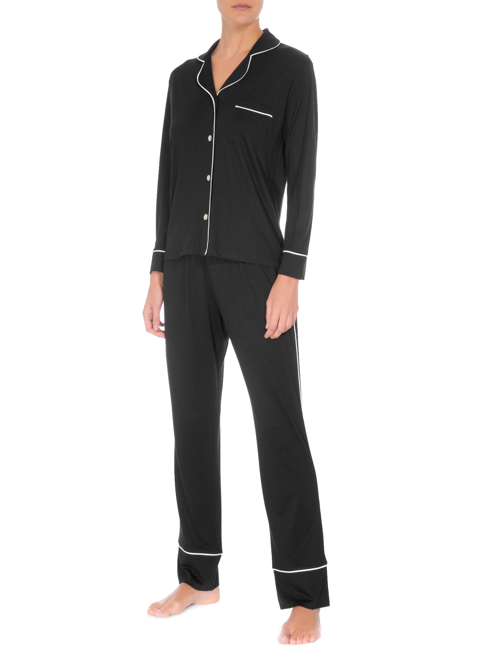 O pijama preto é confeccionado em malha de algodão pima. A blusa possui lapela chanfrada, mangas longas, bolso frontal, detalhe de viés na cor branca, acabamento pespontado e fechamento por botões frontais. A calça possui cós com elástico aplicado, detalhe de viés na cor branca e acabamento pespontado.