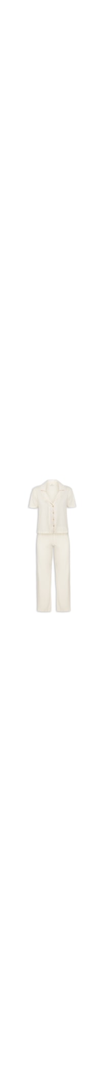 O pijama beje é confeccionado em malha leve de média elasticidade. A camisa solta a corpo possui decote em lapela chanfrada, mangas curtas, leve transparência e fechamento fontal por botões. A calça sola ao corpo possui cintura alta, elástico aplicado no cós, leve transparência e comprimento longo.