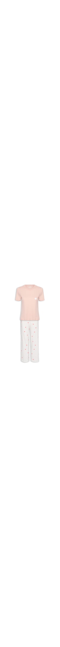 O pijama rosa é confeccionado por malha de algodão com média elasticidade. A blusa solta ao corpo possui decote redondo com acabamento canelado, mangas curtas e estampas figurativa de coração na altura do busto frontal em cor contrastante. A calça solta ao corpo possui cintura média, elástico embutido no cós, mix estampas em cor contrastante e comprimento longo.