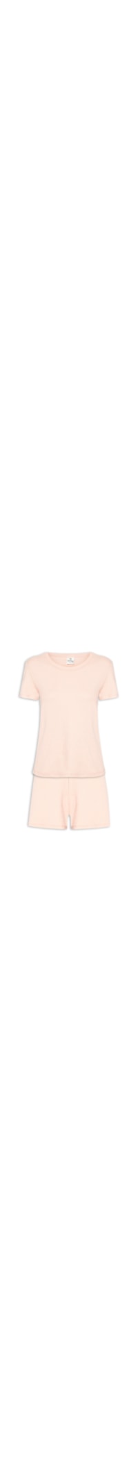 O pijama rosa é confeccionado em malha canelada com média elasticidade. A blusa solta ao corpo possui decote redondo e mangas curtas. O short solto ao corpo possui cintura alta, cós com elástico embutido e comprimento curto.
