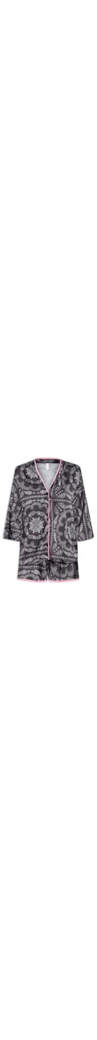 o pijama Preto é Confeccionado Em cetim Sem Elasticidade. A camisa solta Ao Corpo Possui Decote V, Mangas 7/8, Mix De Estampas Em Cores Contrastantes, Aplicação De Viés Em Cor Contrastante E Fechamento Frontal Por Botões. O short solto Ao Corpo Possui Cintura Alta, Cós Com Elástico Embutido, Mix De Estampas Em Cores Contrastantes, aplicação De Viés Em Cor Contrastante e Comprimento Curto.