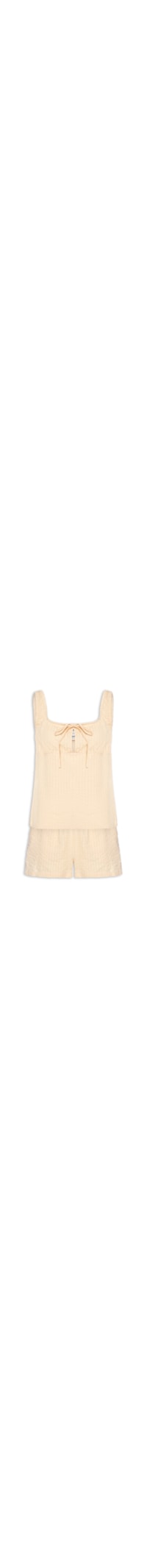 O pijama bege é confeccionado em malha leve sem elasticidade. A blusa possui decote redondo com amarração e recorte vazado no busto, alças com elástico, toque texturizado e estampa de listras. O short possui cós com elástico embutido, cintura alta, bolsos faca e estampa de listras.