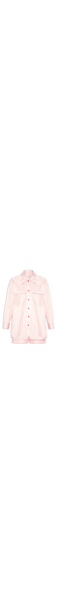 O pijama rosa é confeccionado em tricoline com baixa elasticidade. A camisa solta ao corpo possui colarinho chanfrado, mangas longas com detalhe nos punhos, bolsos frontais, padronagem listrada em cor contrastante e fechamento frontal por botões. O short solto ao corpo possui cintura alta, elástico embutido no cós, padronagem listrada em cor contrastante, comprimento curto e botões aplicados na parte frontal.