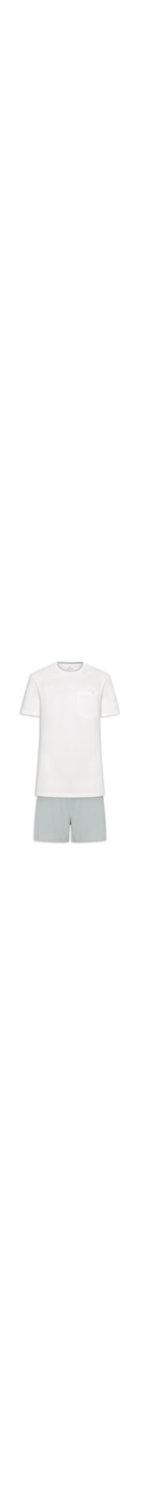 O pijama branco é confeccionado em malha leve de alta elasticidade. A blusa solta ao corpo, possui decote redondo, mangas curtas e bolso frontal. A bermuda solta ao corpo, possui cintura média, cós com elástico embutido e comprimento curto.