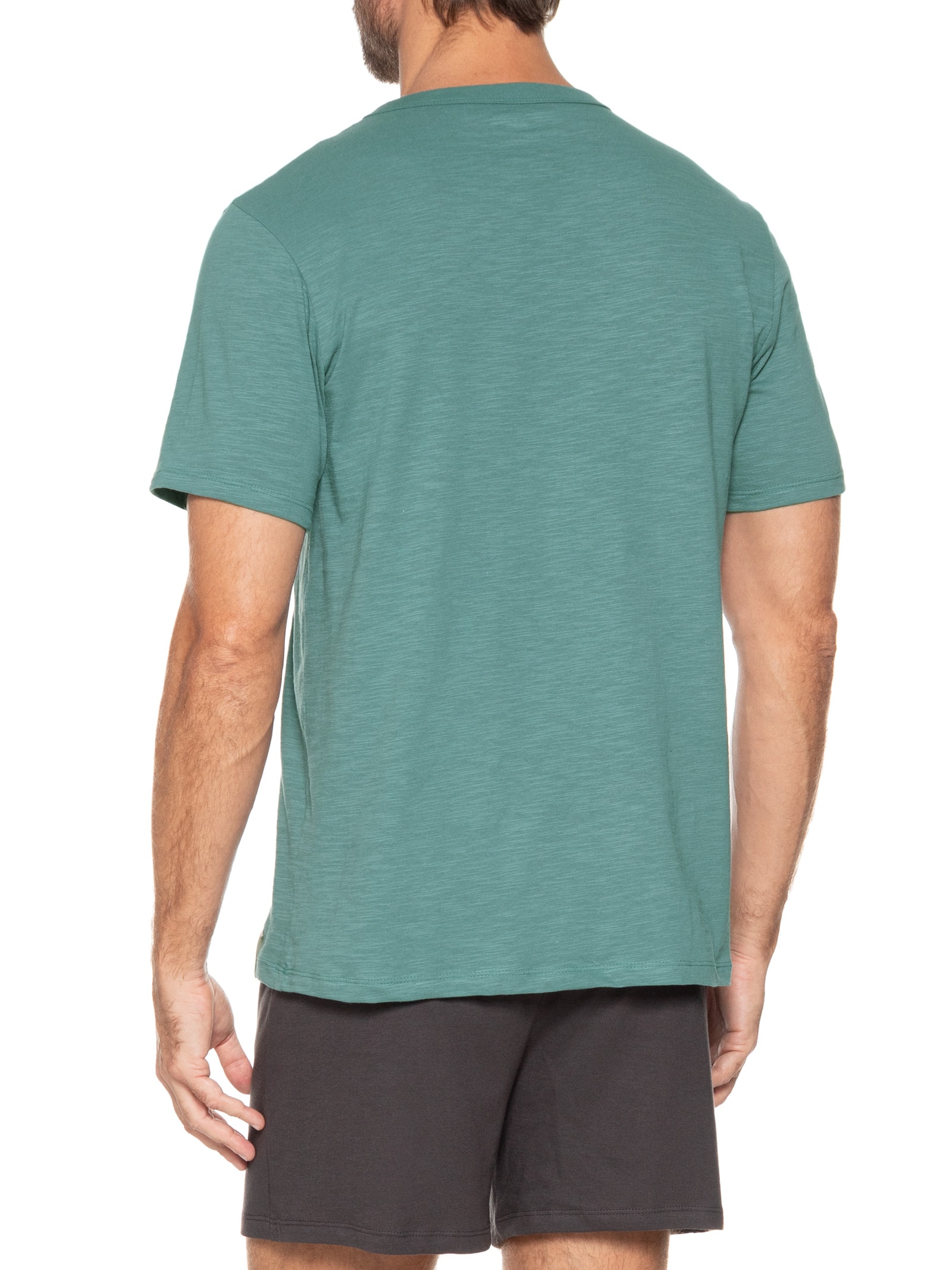 O pijama verde é confeccionado em malha flamê com baixa elasticidade. A camiseta solta ao corpo possui gola careca com acabamento canelado, mangas curtas, efeito de mescla e tag da marca aplicada na parte frontal na barra. A bermuda solta ao corpo possui cintura média, cós com elástico embutido e comprimento curto.