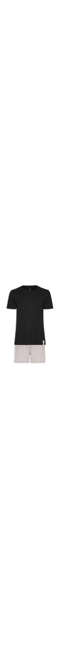 O pijama preto é confeccionado em malha de algodão. A camiseta preta possui gola careca canelada, mangas curtas, tag da marca aplicada na parte frontal, shape solto, caimento reto e acabamento pespontado. O short cinza possui cintura média, cós com elástico com listras em cor cores contrastantes, fendas laterais, caimento reto, shape solto e acabamento pespontado.
