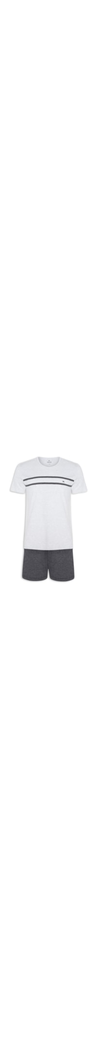 O pijama cinza é confeccionado em tecido leve. A peça possui gola redonda, mangas curtas, logo da marca e detalhe de listras em cor contrastante aplicadas na parte frontal, caimento reto e acabamento pespontado. O short de cor contrastante possui cintura média, cós elástico, caimento reto, comprimento curto e acabamento pespontado.