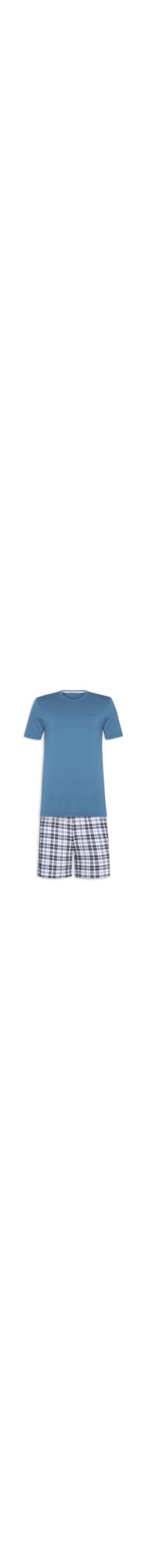 O pijama azul é confeccionado em malha com alta elasticidade. A camiseta solta ao corpo possui gola careca com acabamento canelado, mangas curtas e nome da marca estampado na altura do tórax em cor contrastante. A bermuda solta ao corpo possui cintura média, cós elástico com padronagem de frisos e nome da marca em cor contrastante e padronagem xadrez em cores contrastantes.