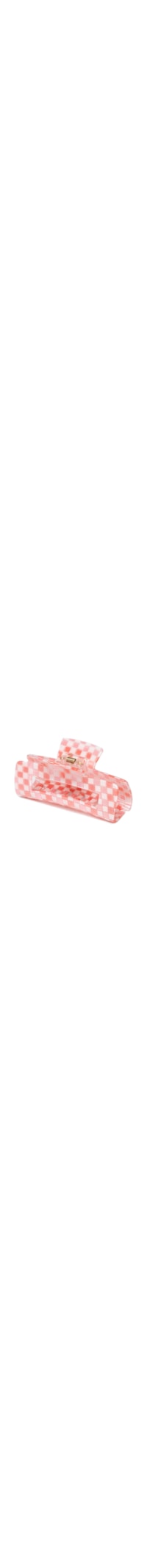 A piranha rosa é produzida em acetato. A peça possui tamanho grande, estampas xadrez em rosa e branco, recorte vazado laterais e fechamento por encaixe.