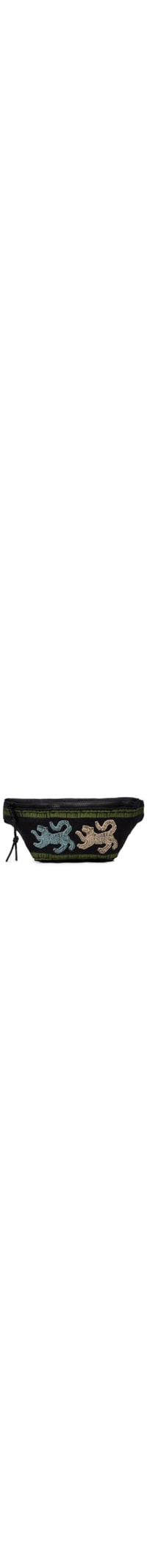 A pochete preta é produzida em material têxtil com superfície texturizada. A peça possui tamanho médio, formato retangular, compartimento interno amplo com forro em tactel e bolso embutido com fechamento por zíper, bordado figurativo aplicado na parte frontal em tons contrastantes, alça regulável em fixa de gorgurão com detalhe do nome da marca em baixo relevo e fechamento superior por zíper