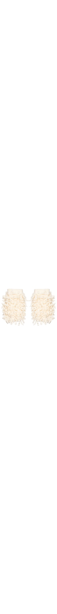 A polaina bege é confeccionada em lã com média elasticidade. A peça possui formato quadrado, tamanho pequeno, acabamentos em elástico e aplicação de franjas ao longo da peça.