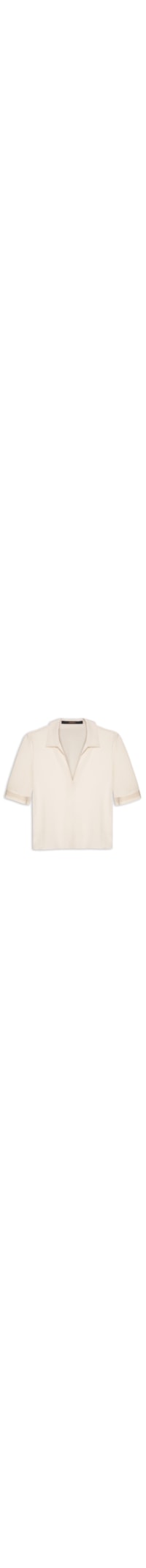 A polo bege é confeccionada em seda sem elasticidade. A peça solta ao corpo possui colarinho clássico, mangas curtas, recorte frontal e leve transparência.