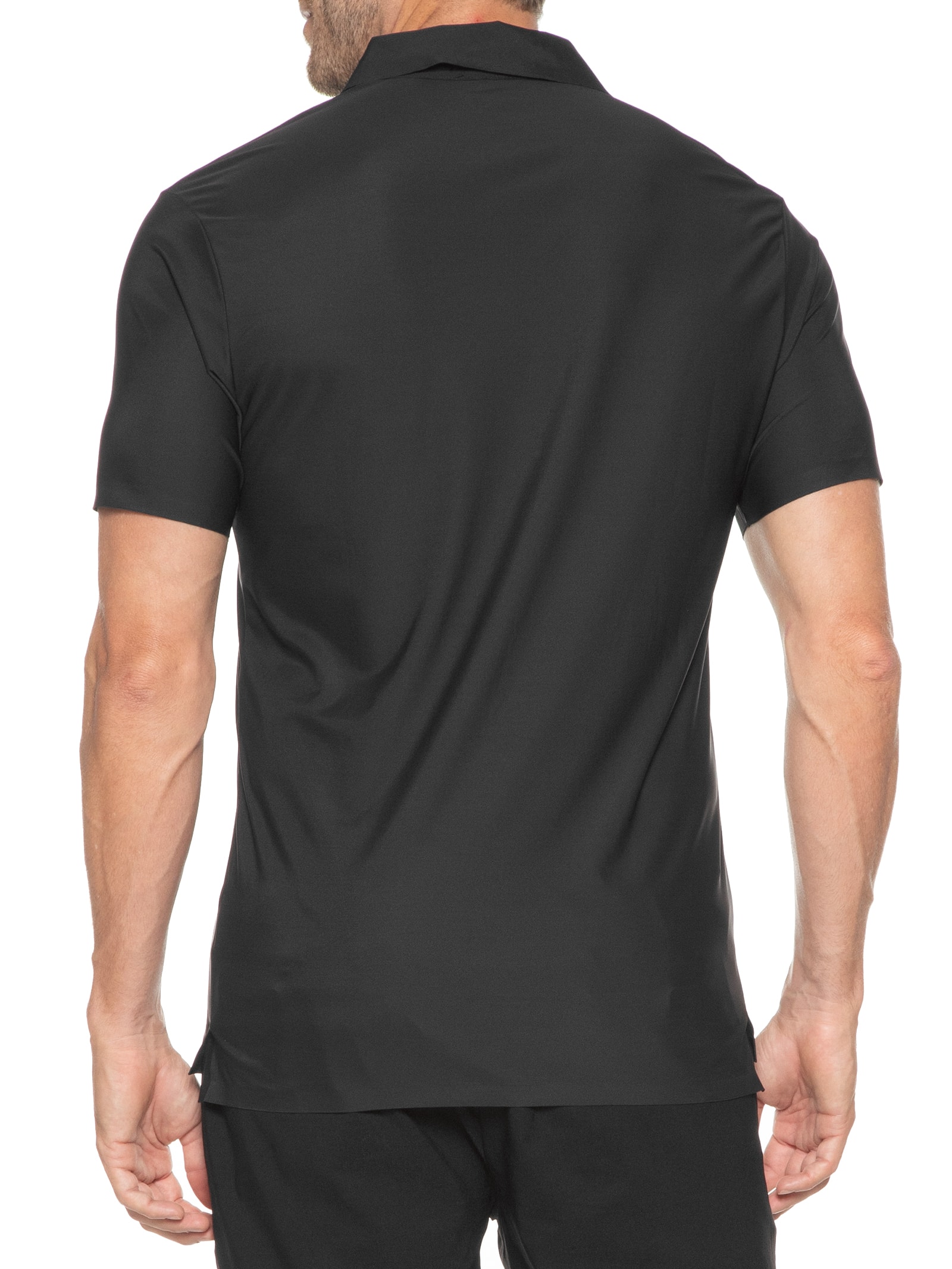 A polo preta é confeccionada em malha de poliamida com baixa elasticidade. A peça solta ao corpo possui gola esporte com abotoamento frontal, mangas curtas e fendas curtas laterais.
