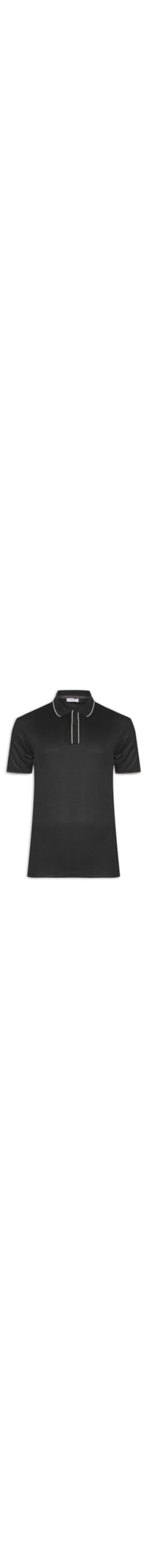 A polo preta é confeccionada em malha leve com baixa elasticidade. A peça solta ao corpo possui gola esporte com abotoamento, mangas curtas, fendas laterais e acabamento canelado nas mangas e gola com frisos em cores contrastantes.