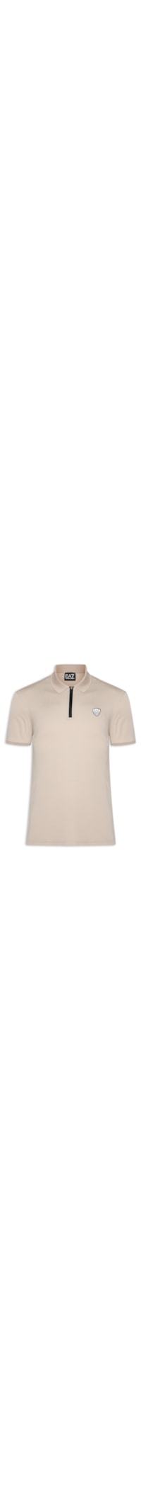 A polo bege é confeccionada em tecido leve com baixa elasticidade. A peça solta ao corpo possui gola esporte, mangas curtas, logo da marca emborrachado aplicado na parte frontal na altura do tórax em cor contrastante branco e fechamento frontal na gola por zíper.