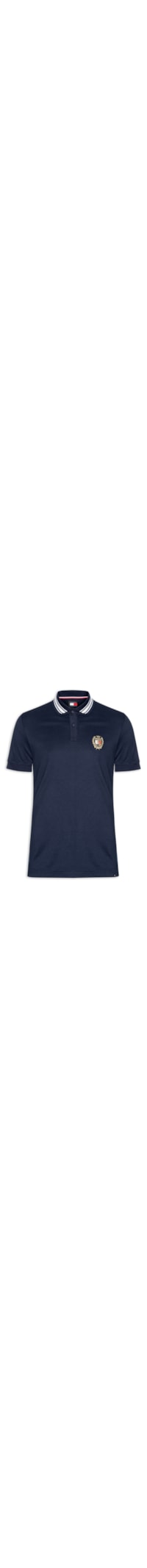 A polo azul marinho é confeccionada em malha de algodão com baixa elasticidade. A peça solta ao corpo possui gola esporte com frisos em cor contrastante e com botões, mangas curtas, logo da marca bordado em cor contrastante na parte frontal na altura do tórax, fendas laterais e acabamento canelado na gola e nas mangas.