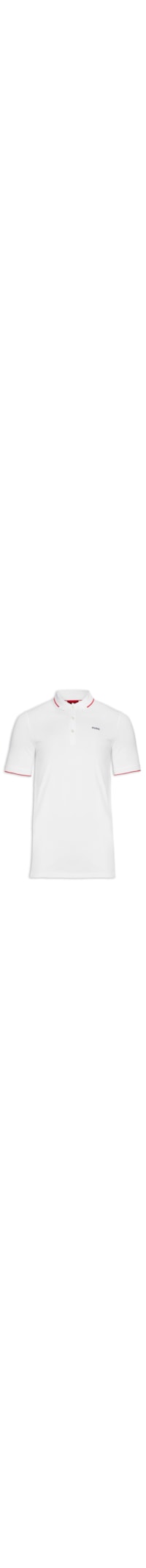 A polo branca é confeccionada em malha leve de média elasticidade. A peça solta ao corpo, possui gola esporte com abotoamento, mangas curtas, gola e punho com acabamento canelado com listras em cor contrastante, logo da marca estampado na parte frontal em cor contrastante, pequenas fendas laterais e comprimento médio.