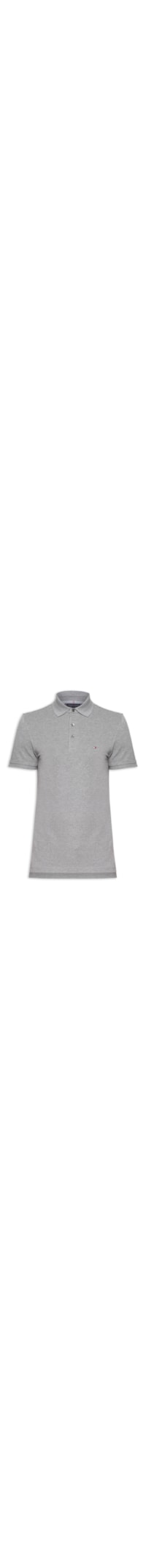 A polo cinza é confeccionada em malha de piquet com alta elasticidade. A peça de modelo slim fit justa ao corpo possui gola esporte com fechamento em botão, mangas curtas, gola e mangas com acabamento canelado, tag da marca aplicada na altura do tórax e pequenas fendas laterais.