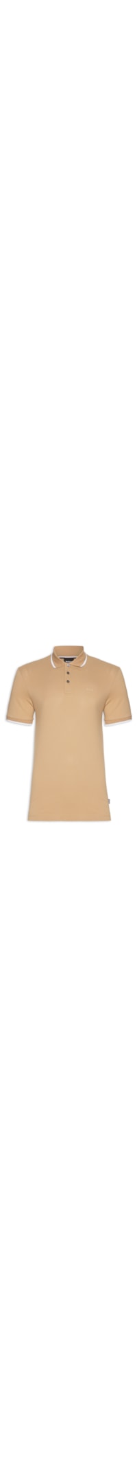 A polo bege é confeccionada por malha de piquet com média elasticidade. A peça solta ao corpo possui colarinho simples, mangas curtas, nome da marca aplicado na altura do tórax, pequenas fendas laterias, tag da marca aplicada na lateral e acabamento canelado e listra branca aplicada na gola e mangas.