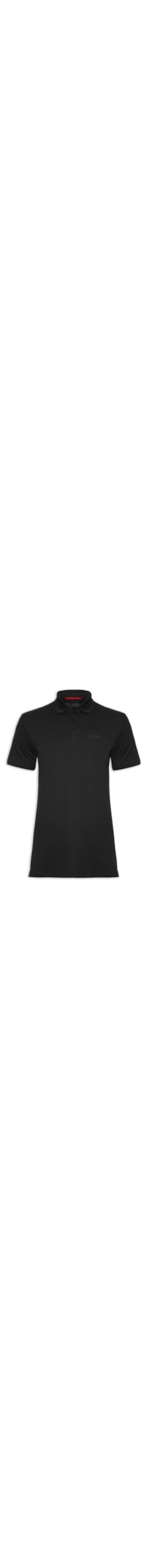 A polo preto é confeccionada por malha de algodão com média elasticidade. A peça solta ao corpo possui gola esporte com acabamento canelado e fechamento botão, mangas curtas, pequenas fendas laterais e nome da marca aplicado na altura do tórax.