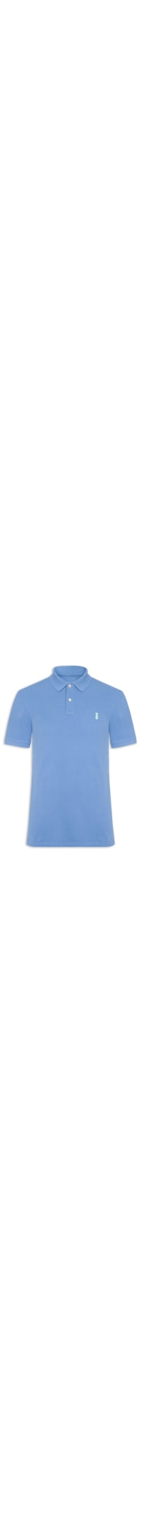 A polo azul é confeccionada em malha de piquet com média elasticidade. A peça de modelo slim fit justa ao corpo possui gola esporte com recorte em V e fechamento por botão, mangas curtas, pequenas fendas laterais e tag da marca bordada na parte frontal em cor contrastante.