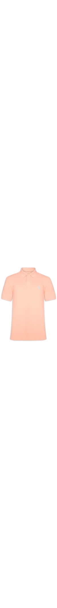 A polo laranja é confeccionada em malha de piquet com média elasticidade. A peça de modelo slim fit ajustada ao corpo possui gola esporte com recorte em V e fechamento por botão, mangas curtas, pequenas fendas laterais e tag da marca bordada na parte frontal em cor contrastante.