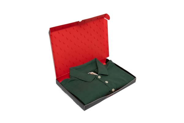A polo verde é confeccionada em malha piquet com média elasticidade. A peça solta ao corpo possui gola esporte com botões aplicados, mangas curras, acabamento canelado na gola e nas mangas, fendas laterais e logo da marca bordado na altura do tórax na cor azul.