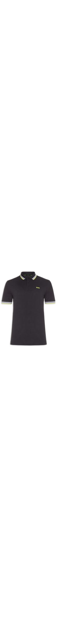 A polo preta é confeccionada em malha piquet com baixa elasticidade. A peça solta ao corpo de modelagem regular, possui gola esporte com abotoamento frontal e padronagem de listras em cor contrastante, mangas curtas com listras em cor contrastante, nome da marca bordado no tórax em cor contrastante e acabamento canelado.