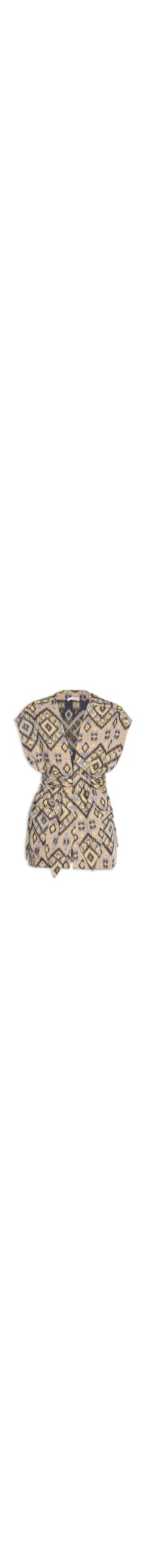 O poncho bege é confeccionado em tecido leve sem elasticidade. A peça solta ao corpo possui decote V profundo, mangas curtas amplas, bolsos frontais, estampa abstrata em cores contrastantes e não possui fechamento. Acompanha faixa no mesmo tecido e estampa para uso opcional.