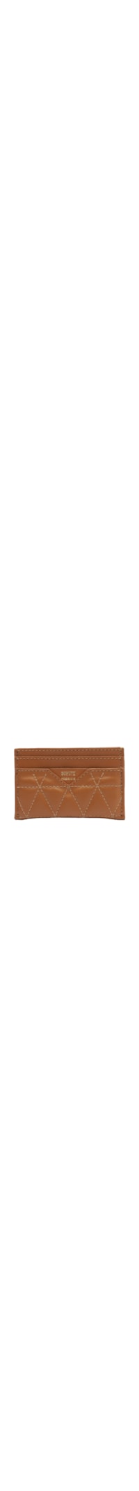O porta cartões marrom é produzido em couro. A peça possui formato retangular, compartimentos posteriores e frontais para cartões, superfície em matelassê e nome da marca timbrado na parte frontal em cor contrastante.