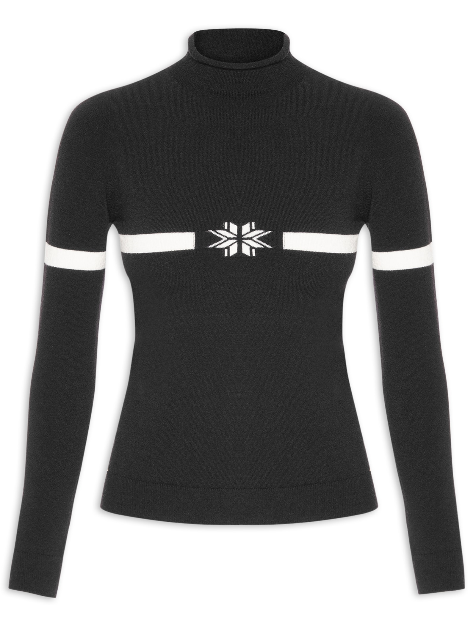 A pullover preta é confeccionada em tricot jacquard com elasticidade. A peça possui gola alta, mangas longas, padronagem de faixas e figurativa na cor branca na altura do busto e tag metalizada da marca na lateral.