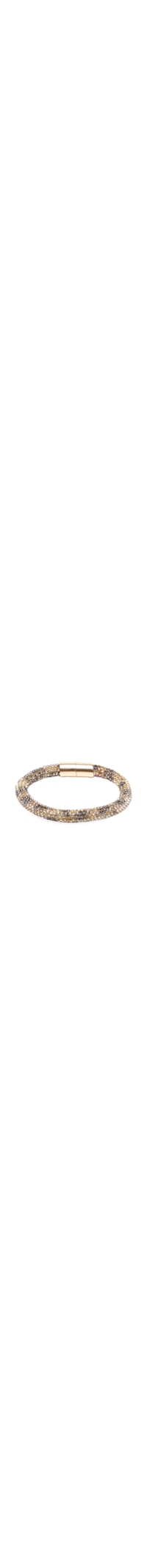 A pulseira dourada é produzida em cordão cravejado. A peça possui espessura média, detalhes de strass prateados e fechamento posterior por ímã.