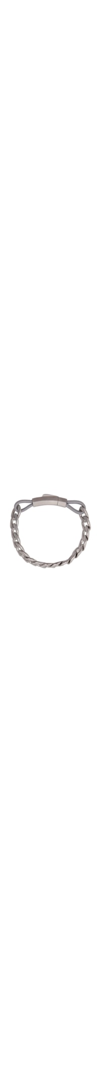 A pulseira prata é produzida manualmente em aço inoxidável. A peça possui espessura média, corrente com elos groumet com superfície texturizada, detalhe de aplicação de elástico, acabamento polido e fechamento por encaixe.