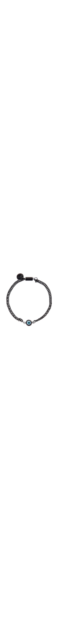 A pulseira preta é produzida em aço. A peça possui corrente em elos cubanos duplos de espessura fina, pingente de olho grego em resina aplicado no centro, medalha pequena com logo da marca aplicada no fecho e fechamento por bastão de encaixe magnético.