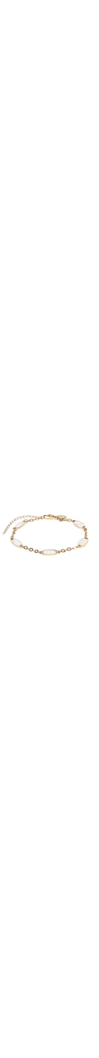 A pulseira dourada é produzida em aço inoxidável banhado a ouro. A peça possui espessura fina, pingentes geométricos com aplicação de pedras naturais, pingente com logo da marca aplicado, corrente extensora e fechamento por fecho lagosta. Acompanha case de acrílico e flanela para limpeza.