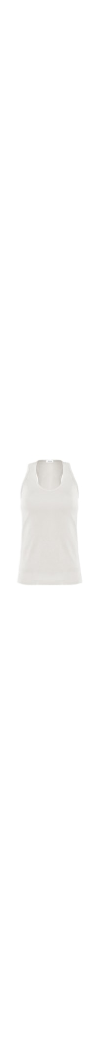A regata off white é confeccionada em malha. A peça de modelo nadador possui decote U, cavas estendidas, shape solto, caimento reto e acabamento pespontado.