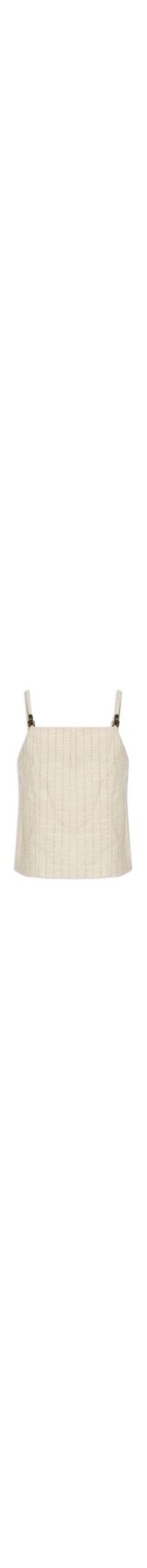 A regata bege é confeccionada em tecido leve com toque de linho. A peça solta ao corpo possui decote reto, cavas estendidas, fendas na parte lateral da barra, recortes frontais, forro, aplicação de aviamentos nas alças e padronagem em listras.