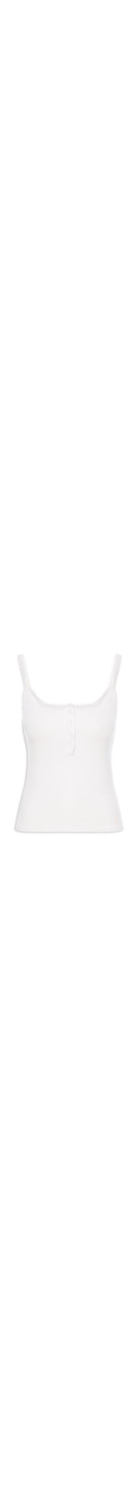 A regata branca é confeccionada em tecido leve com alta elasticidade. A peça justa ao corpo possui decote redondo com ajuste por botões, cavas regulares, alças finas em renda, aplicação de renda no busto e na parte posterior e superfície canelada.