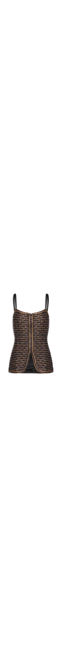 A regata preta é confeccionada em tecido encorpado sem elasticidade. A peça solta ao corpo possui decote reto, alças finas, padronagem texturizada com trama aparente e fios contrastantes, barra com fenda central na parte frontal, forro interno e fechamento posterior por zíper.