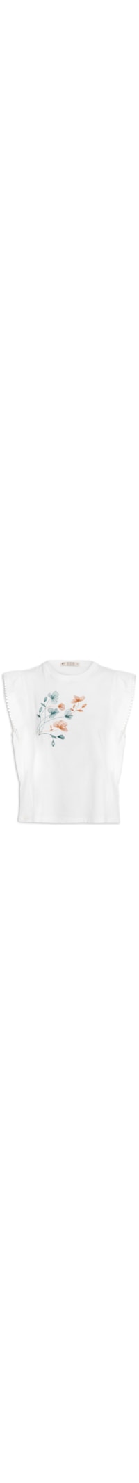 A regata off white é confeccionada em malha de algodão com média elasticidade. A peça solta ao corpo possui decote redondo com acabamento canelado, ombros estendidos com detalhe de babado e aplicação de passamanaria, recortes frontais e posteriores, aplicação frontal de bordados florais em tons contrastantes e tag metalizada da marca aplicada na parte frontal.